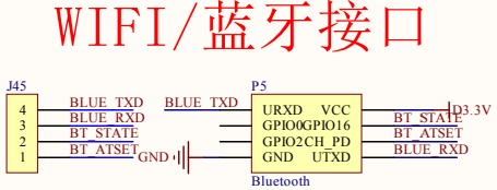 又见独立电路,其中P5 接口是 WIFI/蓝牙模块的接口,可以将ESP8266-WIFI 模块接在此接口,模块的电源管脚给电后,将WIFI/蓝牙模块芯片的控制管脚接至J45 端子上,方便于我们自行将控制管脚与单片机连接。ESP8266-WIFI 模块一般只需要 UTXD、URXD、CH_PD、RST 控制管脚即可,RST 对应原理图的GPIO16,也就是 J45 端子上的 BT_STATE。这4个引脚中,串口必须和单片机串口连,另外2个用其它任意单片机管脚控制即可。