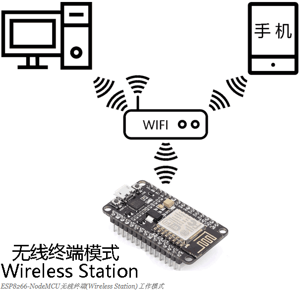 如下图所示,ESP8266可通过WiFi连接无线路由器。这与用手机通过WiFi连接无线路由器的模式相同。