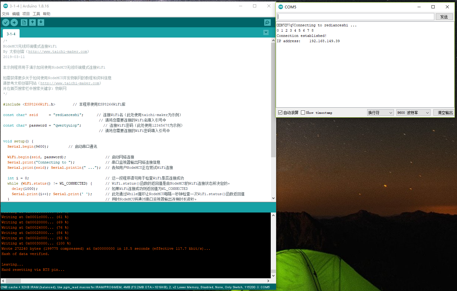 | /* NodeMCU无线终端模式连接WiFi By 太极创客(http://www.taichi-maker.com) 2019-03-11 本示例程序用于演示如何使用NodeMCU无线终端模式连接WiFi 如需获得更多关于如何使用NodeMCU开发物联网的教程和资料信息 请参考太极创客网站(http://www.taichi-maker.com) 并在首页搜索栏中搜索关键字:物联网 */ "#include <ESP8266WiFi.h> // 本程序使用ESP8266WiFi库 const char* ssid = "taichi-maker"; // 连接WiFi名(此处使用taichi-maker为示例) // 请将您需要连接的WiFi名填入引号中 const char* password = "12345678"; // 连接WiFi密码(此处使用12345678为示例) // 请将您需要连接的WiFi密码填入引号中 void setup() { Serial.begin(9600); // 启动串口通讯 WiFi.begin(ssid, password); // 启动网络连接 Serial.print("Connecting to "); // 串口监视器输出网络连接信息 Serial.print(ssid); Serial.println(" ..."); // 告知用户NodeMCU正在尝试WiFi连接 int i = 0; // 这一段程序语句用于检查WiFi是否连接成功 while (WiFi.status() != WL_CONNECTED) { // WiFi.status()函数的返回值是由NodeMCU的WiFi连接状态所决定的。 delay(1000); // 如果WiFi连接成功则返回值为WL_CONNECTED Serial.print(i++); Serial.print(' '); // 此处通过While循环让NodeMCU每隔一秒钟检查一次WiFi.status()函数返回值 } // 同时NodeMCU将通过串口监视器输出连接时长读秒。 // 这个读秒是通过变量i每隔一秒自加1来实现的。 Serial.println(""); // WiFi连接成功后 Serial.println("Connection established!"); // NodeMCU将通过串口监视器输出"连接成功"信息。 Serial.print("IP address: "); // 同时还将输出NodeMCU的IP地址。这一功能是通过调用 Serial.println(WiFi.localIP()); // WiFi.localIP()函数来实现的。该函数的返回值即NodeMCU的IP地址。 } void loop() { }"