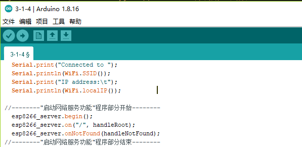 程序第一句esp8266_server.begin()使用了ESP8266WebServer库中的begin函数。这个函数的作用是让ESP8266-NodeMCU来启动网络服务功能。该函数无需任何参数。