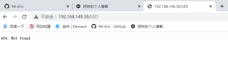 为了验证这一功能,我们来做一个实验。在浏览器中输入NodMCU的IP地址然后加一个“/LED”再回车。比如下图所示,我的NodeMCU的IP地址是192.168.149.39,那么当我在浏览器栏中输入192.168.149.39/LED然后回车,就会看到浏览器显示出文字404: Not found。