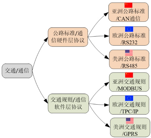 为了更加形象的理解软硬件层面的通信协议,我们将通信比作交通,通信的硬件层协议比作各国的公路标准,各国的公路标准类似于不同的硬件层协议标准;通信的软件层协议比作各国的交通规则,各国的交通规则类似于不同的软件层协议标准。
