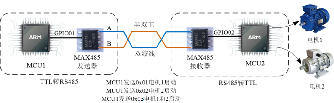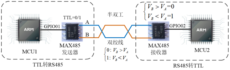 RS-485通信为半双工通信,意思是MCU1和MCU2可以互相发送和接受数据,但有一点应注意,由于RS-485只有一对差分信号线A/B,故对于MCU1来说发送和接受数据不能同时进行。故在MCU1要顺利实现发送和接受数据则需要在软件层面上指定通信协议。