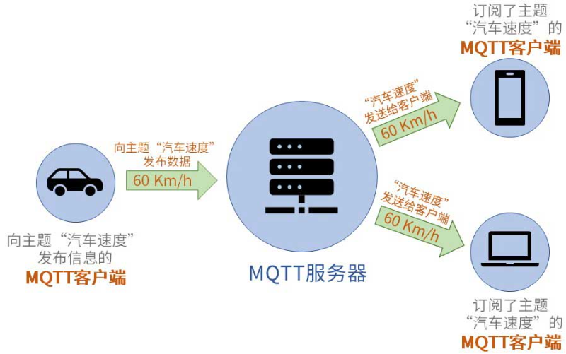 在以上图示中一共有三个MQTT客户端,它们分别是汽车,手机和电脑。MQTT服务端在管理MQTT通讯时使用了“主题”来对信息进行管理的。比如上图所示,假设我们需要利用手机和电脑获取汽车的速度,那么我们首先要利用电脑和手机向MQTT服务器订阅主题“汽车速度”。接下来,当汽车客户端向服务端的“汽车速度”主题发布信息后,服务端就会首先检查一下都有哪些客户端订阅了“汽车速度”这一主题的信息。当它发现订阅了该主题的客户端有一个手机和一个电脑,于是服务端就会将刚刚收到的“汽车速度”信息转发给订阅了该主题的手机和电脑客户端。