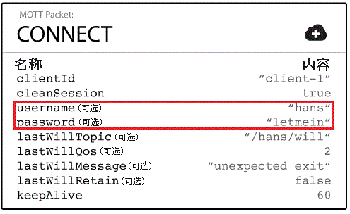 到目前为止,我们已经将CONNECT报文中的信息大部分讲解完毕,目前只剩下上图中红色方框所标注的username(用户名)和password(密码)。这里的用户名和密码是用于客户端连接服务端时进行认证需要的。