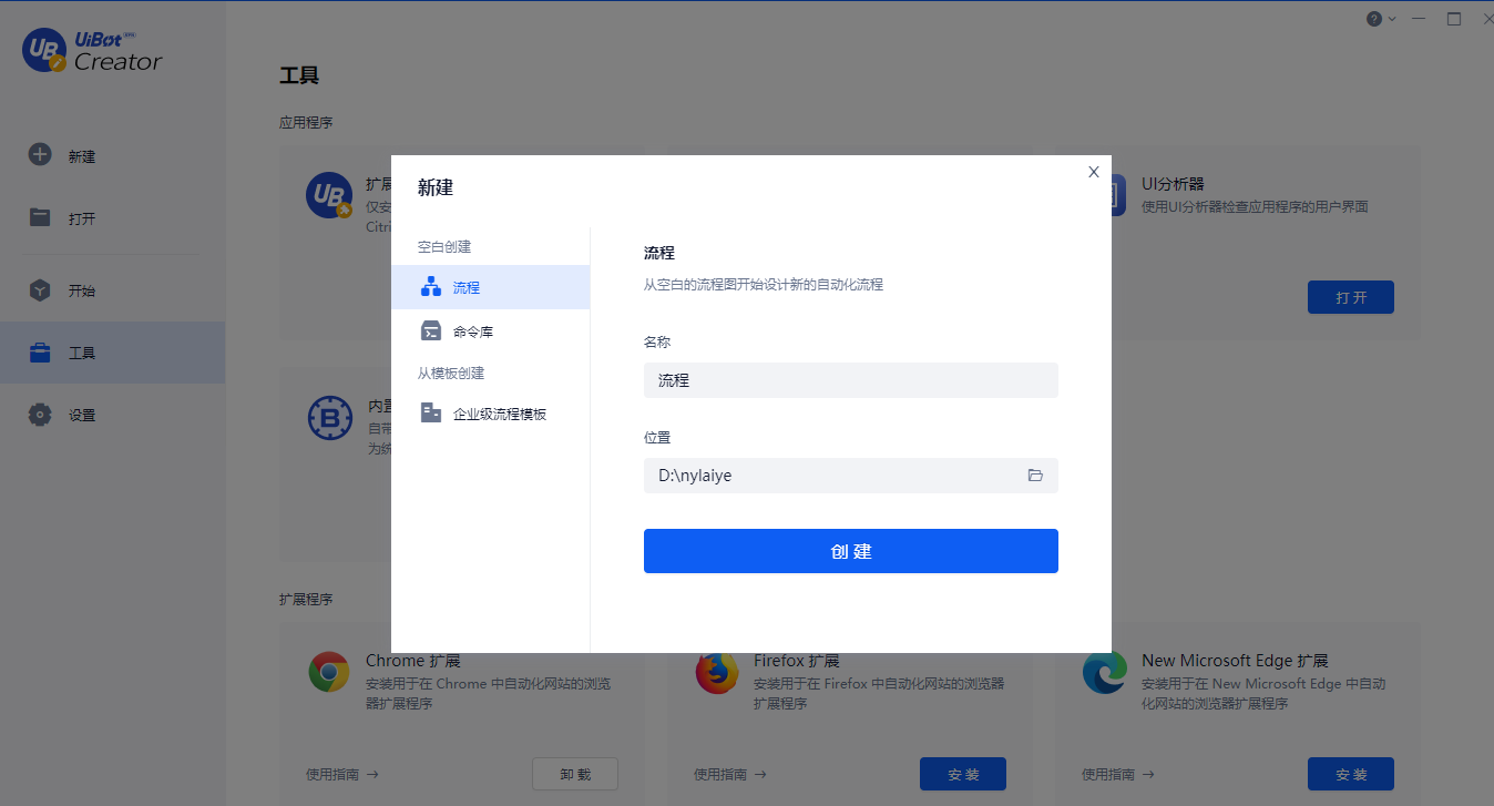 回到Creator,开始正常的文件新建流程,和word、excel类似的操作,只不过这个应用把需要点击的命令变成了拖拽式的图标和可以进一步编程控制的代码命令。文件名称和位置自己改下即可。