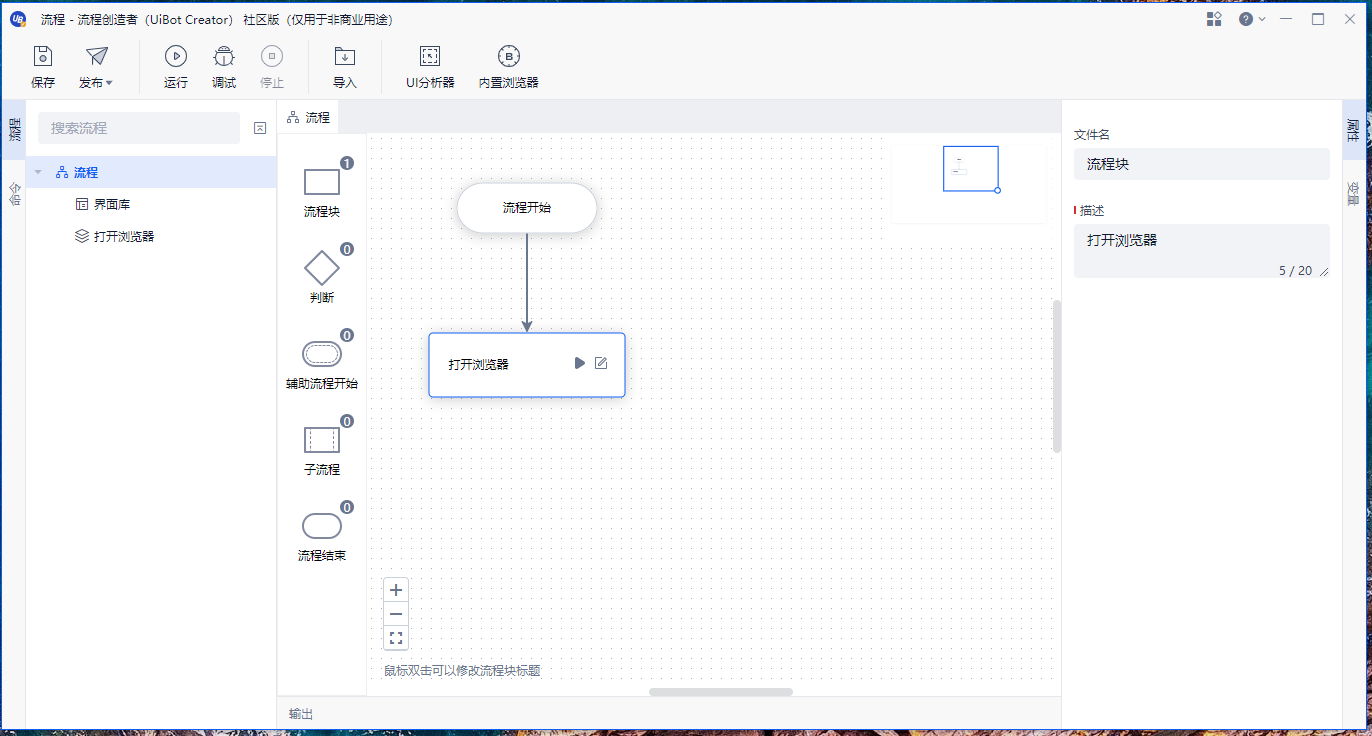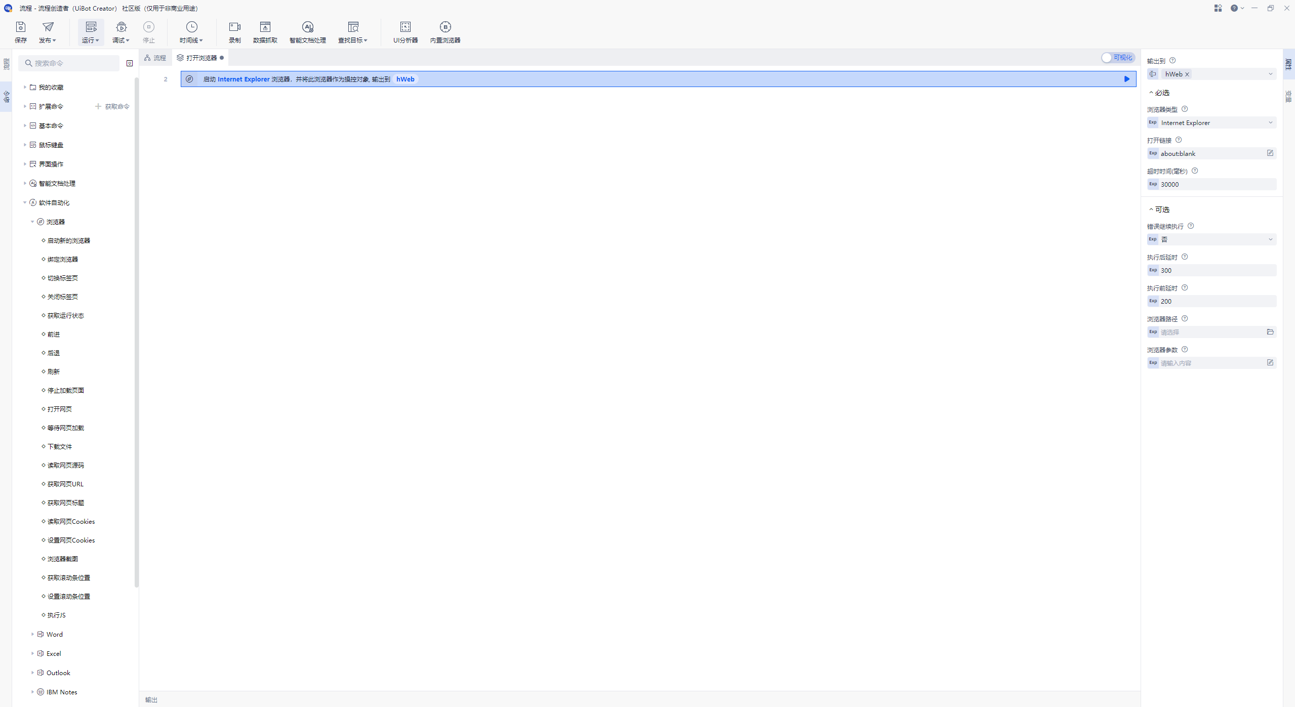 这时候我们可以点击播放动作,看下我们目前的操作有没有问题,点击流程块的播放按钮,会打开一个空白的浏览器:
