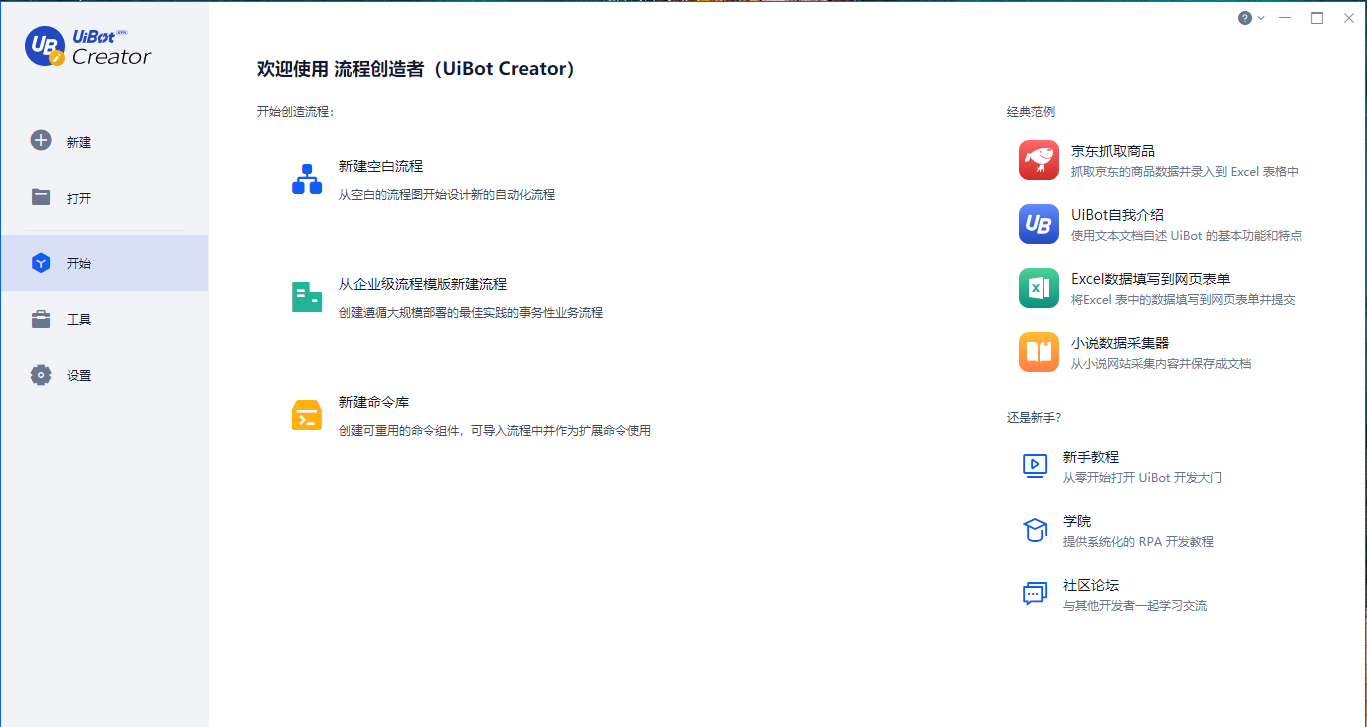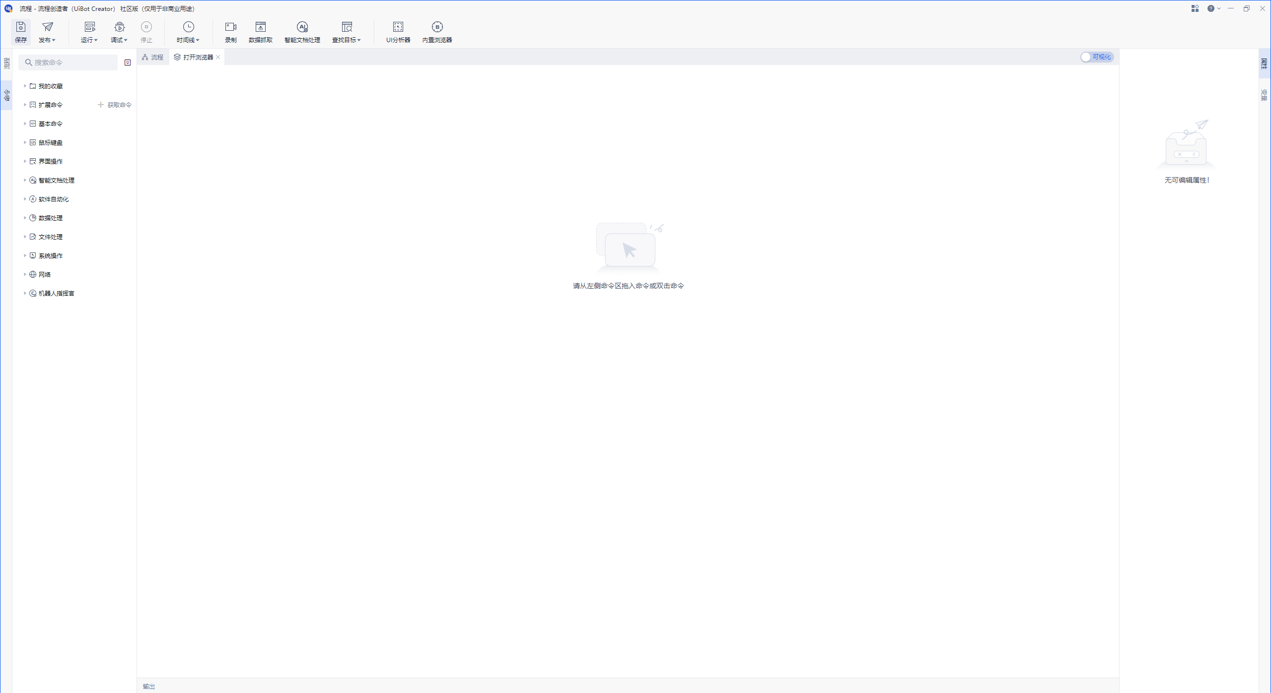 同样的界面,左边命令栏,右边属性栏。在左边的命令栏我们找到浏览器相关的命令:软件自动化→浏览器→启动新的浏览器(双击或者直接拖拽到中间的空白区域)