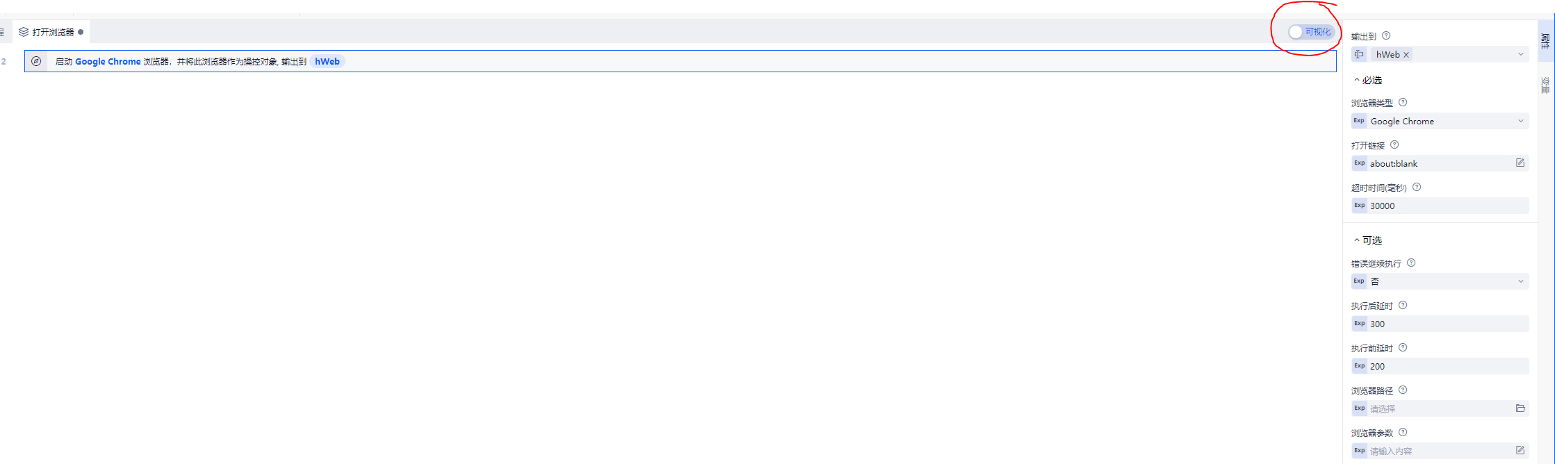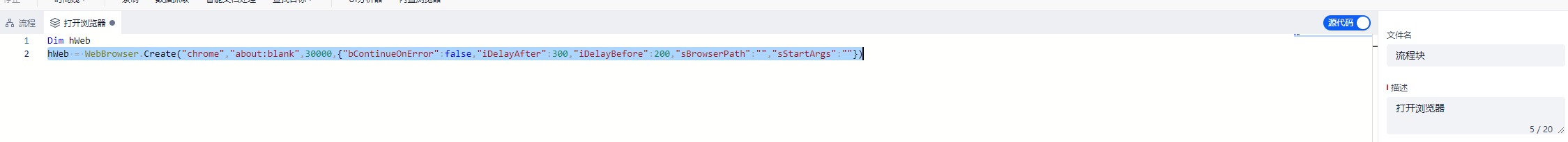 再点击可视化,将第一行的行内赋值删除(DIM hWeb),我们需要一个全局的web对象,方便下个流程来关闭浏览器:
