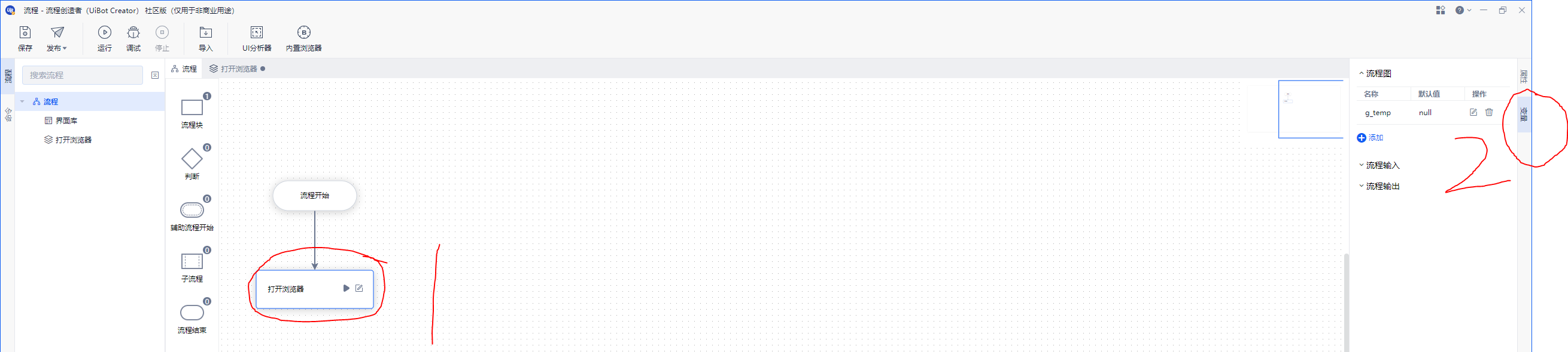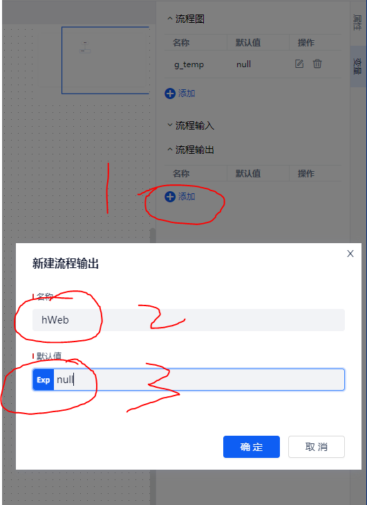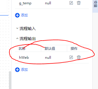 删除后保存,我们从可视化切回,回到流程里,再次点击流程块,右侧变量栏我们新增一个流程输出变量(全局变量),名称叫hWeb,默认值为null(js语法),点击确认: