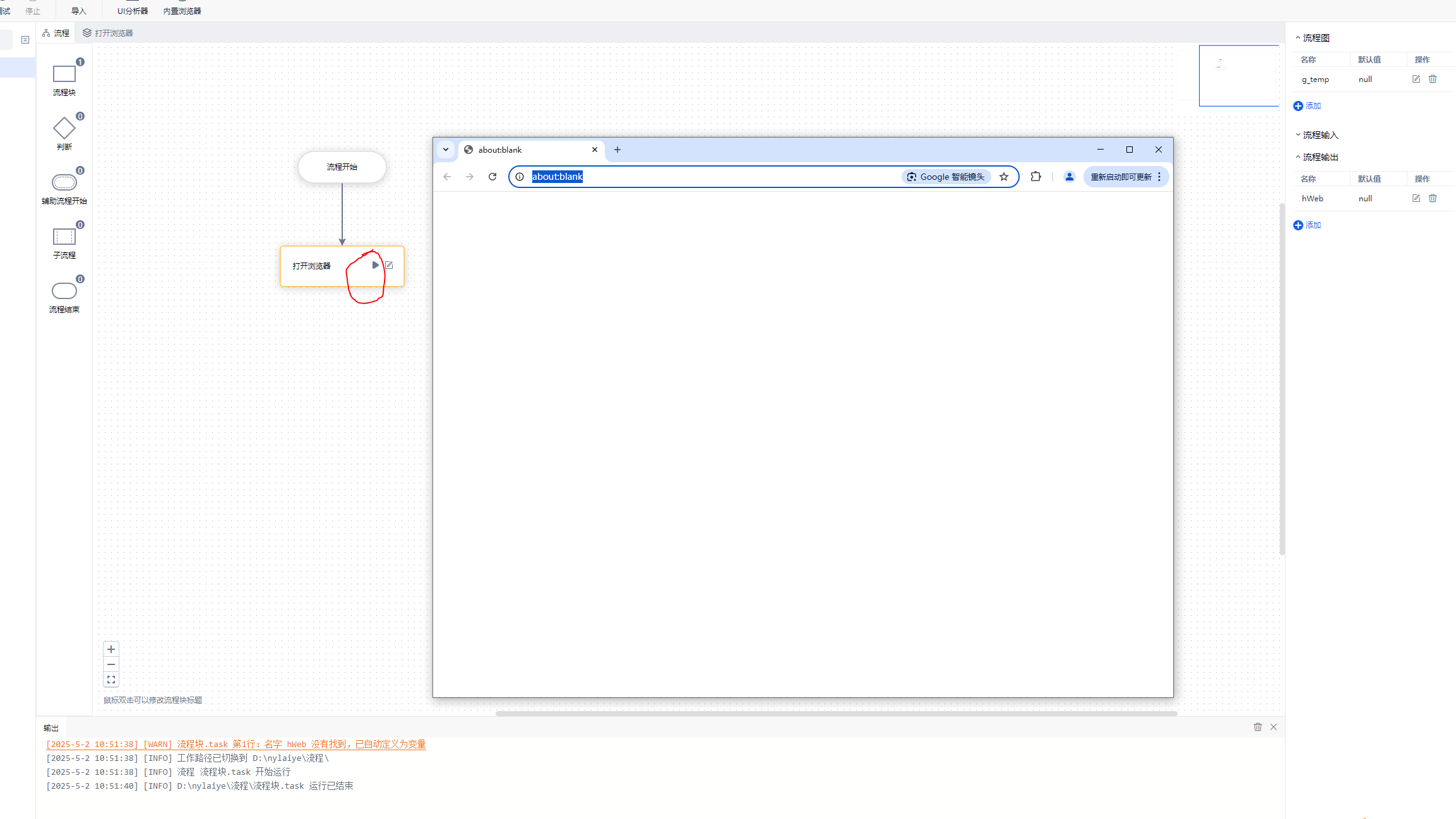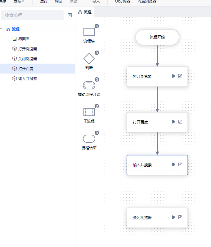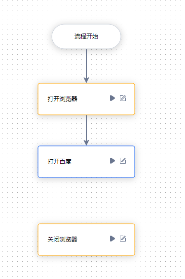 此时回到流程图里,点击打开浏览器的播放按钮,会先打开一个浏览器,然后浏览器又会自动关闭。