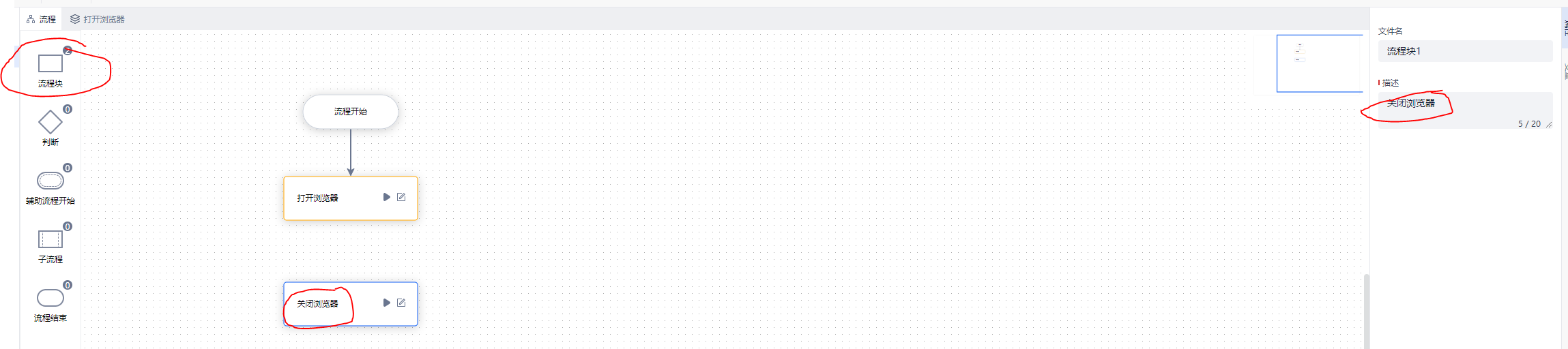 当流程执行完成后,这个浏览器也没有关闭,还是会一直打开,这里因为我们并没有对这个浏览器做关闭操作,我们再加一个新的流程,并将打开浏览器的后续连接到新的流程上,叫关闭浏览器: