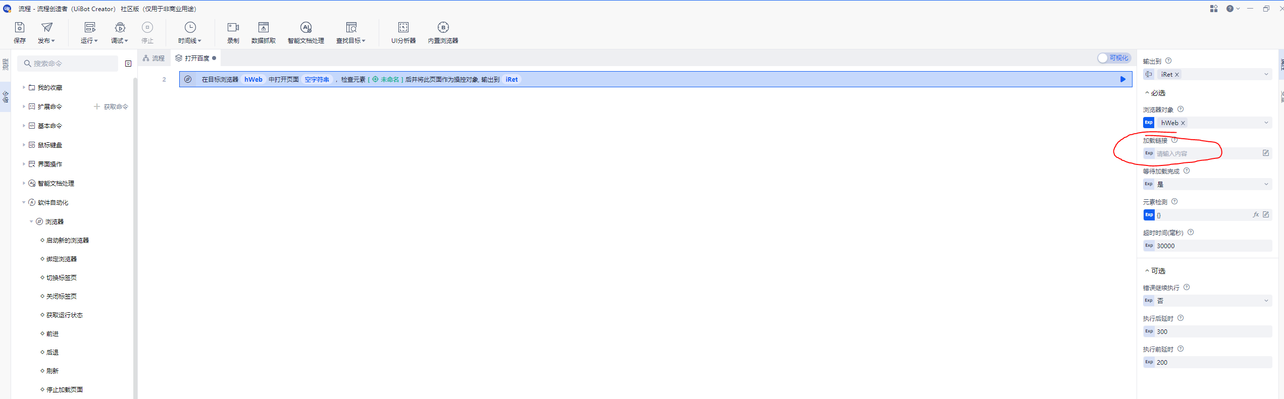 打开百度的流程块我们点击编辑属性,在左边的命令栏我们找到浏览器相关的命令:软件自动化→浏览器→打开网页,双击后我们观察到界面右侧属性栏里有加载链接,我们填入www.baidu.com。
