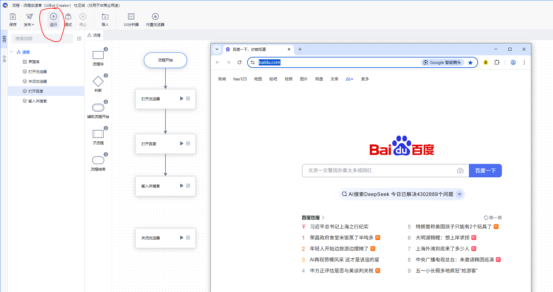 首先我们得运行一次全流程,确保打开一个百度页面,这样方便后续的步骤进行。