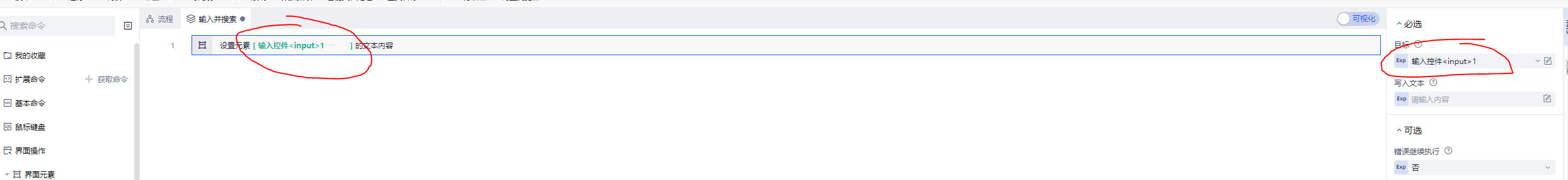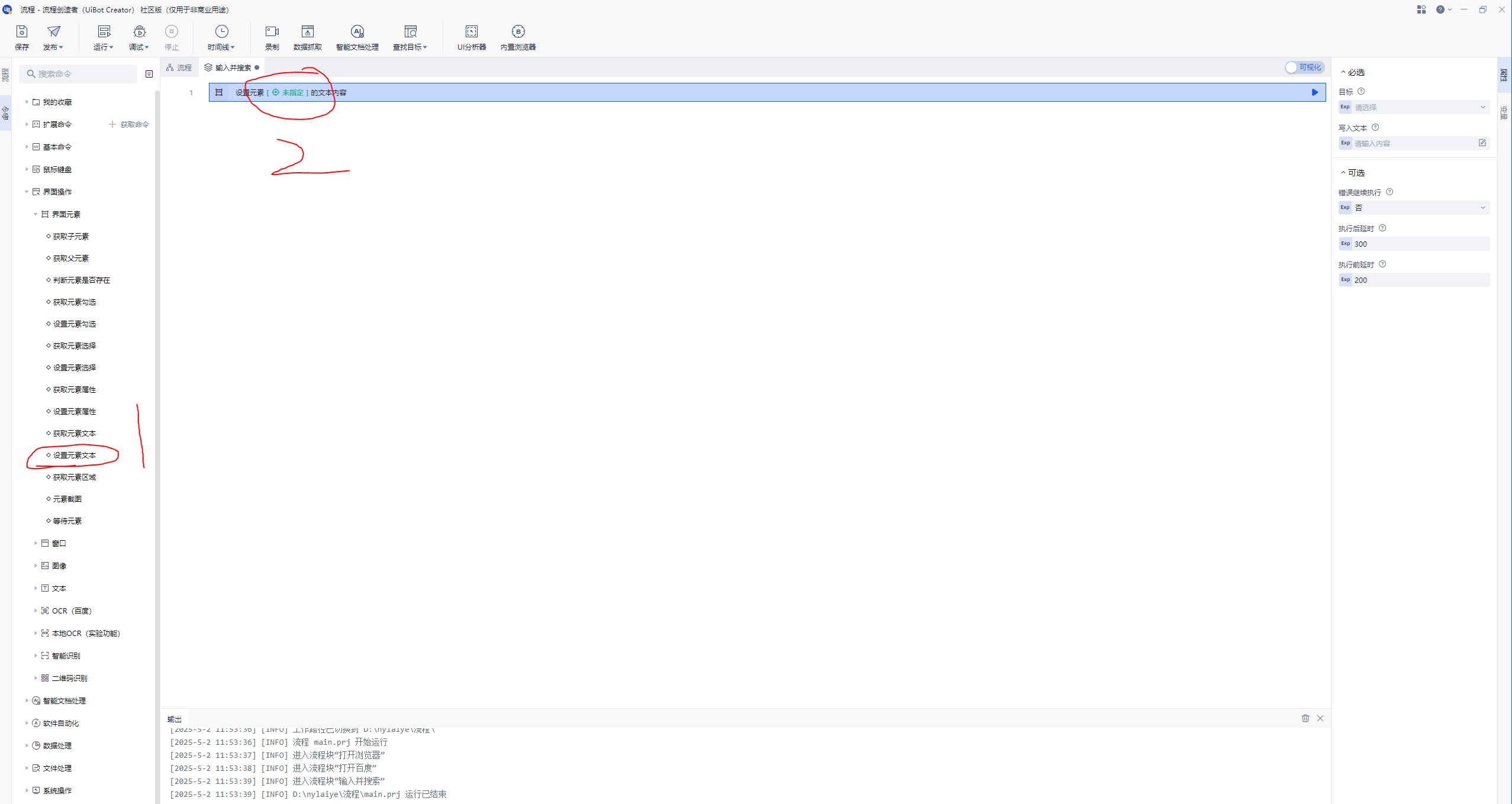 接下来点击流程块的编辑命令,找到界面操作->界面元素->设置元素文本,拖入命令后单击未指定,如下图: