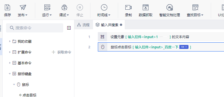 继续,截下来就是搜索内容的设置了。这个步骤我们要做的是:聚焦百度页面的搜索框位置,然后输入我们需要搜索的文字,然后点击百度一下的按钮。OK,我们再新增一个流程块:输入并搜索。