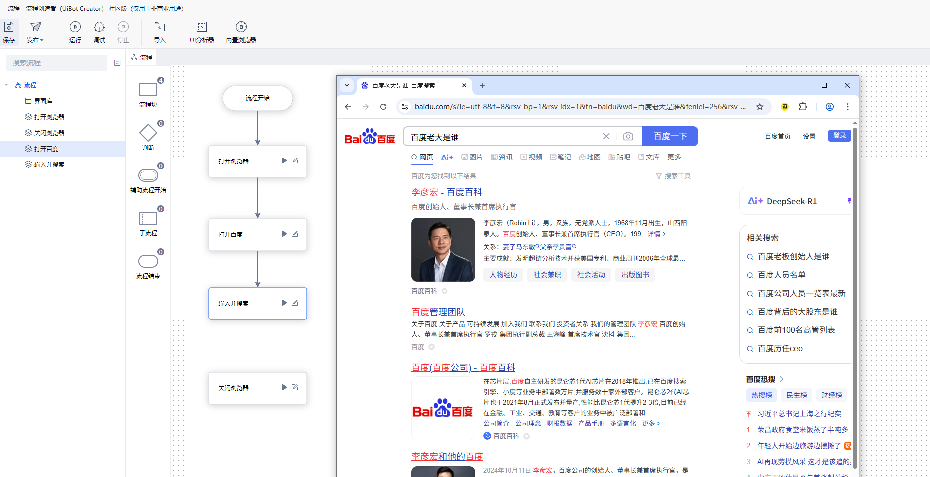 百闻不如一见,举个栗子做一下:比如我想实现我只要点击开始命令,程序就自动执行在百度里搜索百度老大是谁的动作。