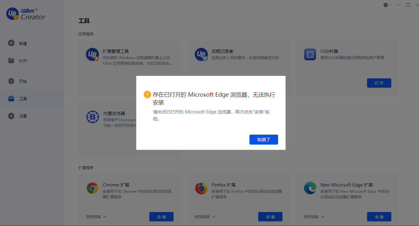 因为有浏览器开着,所以提示我这个,关闭浏览器重新安装Chrome扩展程序。