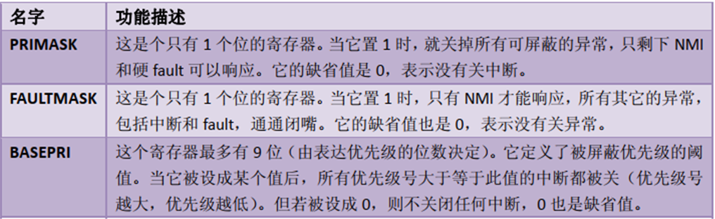 三个中断屏蔽寄存器,分别为PRIMASK、FAULTMASK和BASEPRI: