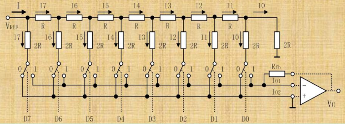 DAC 主要由数字寄存器、模拟电子开关、位权网络、求和运算放大器和基准电压源(或恒流源)组成。用存于数字寄存器的数字量的各位数码,分别控制对应位的模拟电子开关,使数码为 1 的位在位权网络上产生与其位权成正比的电流值,再由运算放大器对各电流值求和,并转换成电压值。上述的模拟电子开关都分别接着一个分压的器件,比如说电阻。模拟开关的个数取决于 DAC 的精度。那么 N 个电子开关就把基准电压分为N 份(并不是平均分哦),而这些开关根据输入的二进制每一位数据对应开启或者关闭,把分压的器件上的电压引入输出电路中。