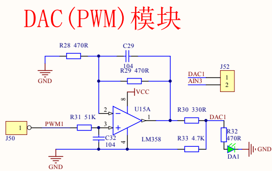 输入信号:PWM 输出控制管脚(任意单片机引脚)接至J50 端子上;输出:DAC1 为 PWM 输出信号,将其连接一个 LED,这样可以通过指示灯的状态直观的反映出 PWM 输出电压值变化。LM358 芯片与这些电容电阻构成了一个跟随电路,即输入是多少,输出即为多大电压,输出电压范围是 0-5V。