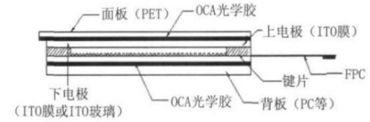 电阻式触摸屏基本上是薄膜加上玻璃的结构,薄膜和玻璃相邻的一面上均涂有 ITO(纳米铟锡金属氧化物)涂层,ITO 具有很好的导电性和透明性。当触摸操作时,薄膜下层的 ITO 会接触到玻璃上层的 ITO,经由感应器传出相应的电信号,经过转换电路送到处理器,通过运算转化为屏幕上的X、Y 值,而完成点选的动作,并呈现在屏幕上。电阻式触摸屏结构如下图所示: